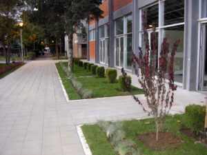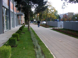 Na ozelenjavanju ovog poslovnog objekta primenjen je modernistički stil projektovanja i uređenja zelenila. Uređenje je podrazumevalo kompletno ozelenjavanje površina ispred poslovnog objekta Ratko Mitrović na Novom Beogradu. Mere koje su preduzete podrazumevale su skidanje zagađene zemlje i uklanjanje šuta, humuziranje terena, sadnja ukrasnog šiblja, sadnja pokrivača tla, postavljanje travnog busena, izrada traka od bele rizle, postavljanje ukrasnih žardinjera sa sadnjom… Radovi su izvođeni po projektu projektanta S.K.
